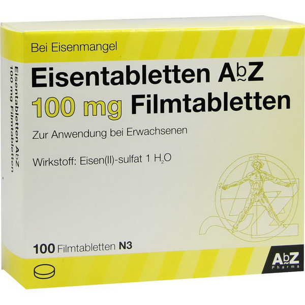 Eisentabletten AbZ 100 mg Filmtabletten Eisentabletten AbZ 100 mg Filmtabletten Wirkstoff: Eisen (II)-sulfat-1 H2O Anwendungsgebiete: Behandlung von Eisenmangelzuständen. Warnhinweis: Filmtabl. enthalten Lactose und Sucrose! Zu Risiken und Nebenwirkungen lesen Sie die Packungsbeilage und fragen Sie Ihren Arzt oder Apotheker. Stand: 10/12.