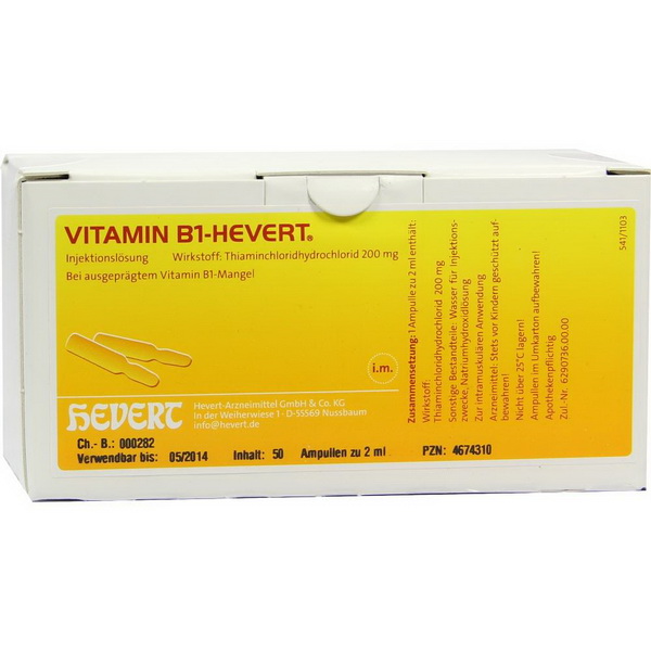 Zur anfänglichen Vitamin B1-Therapie werden täglich eine halbe bis 1 Ampulle 'Vitamin B1-Hevert' (entsprechend 100-200 mg Thiaminchloridhydrochlorid) vorsichtig und langsam tief intramuskulär injiziert.