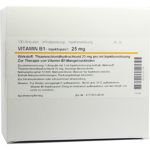 Als Injektionslösung zur intramuskulären und intravenösen Anwendung 50-100 mg Thiaminchloridhydrochlorid täglich (entsprechend 2-4 Ampullen VITAMIN B1-Injektopas® 25 mg 1-mal täglich) vorsichtig und langsam intramuskulär/intravenös injizieren, in Einzelfällen auch mehr.